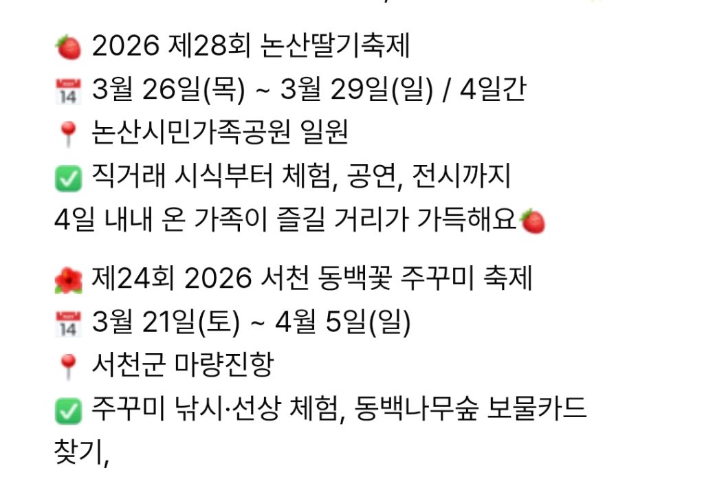 [스크랩] [기타]논산딸기축제에서 판매 한다는 딸기 먹거리 작성자밤의 리스너|작성시간26.03.27|조회수2,249 목록 댓글 10 글자크기 작게가 글자크기 크게가 다음검색 스크랩 원문 : 樂soccer 현재 게시글 추가 기능 열기 북마크 공유하기 신고 센터로 신고 댓글 댓글 10 댓글쓰기 답글쓰기 댓글 리스트 작성자재-쥬래갠 | 작성시간 26.03.27 전부 다 먹어보고싶다 작성자getlucky | 작성시간 26.03.28 하나같이 맛있어보여 작성자초콜릿우체국 | 작성시간 26.03.28 미쳐어어어 먹고싶다아아아 작성자빛속 | 작성시간 26.03.29 제발 수도권에서도 팔아주심이.. 작성자아라호 | 작성시간 26.03.30 모찌 말고 찹쌀떡 하자 댓글 전체보기