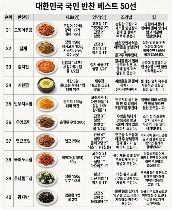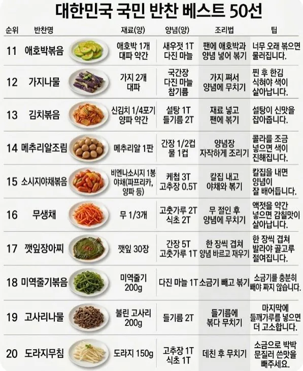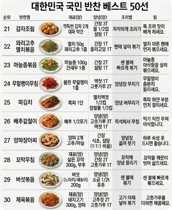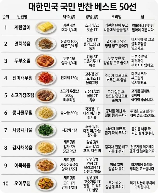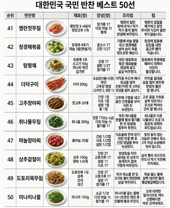 [스크랩] [기타]대한민국 국민 반찬 베스트 50선 작성자고양이|작성시간26.04.07|조회수45,129 목록 댓글 6 글자크기 작게가 글자크기 크게가 다음검색 스크랩 원문 : 쭉빵카페 현재 게시글 추가 기능 열기 북마크 공유하기 신고 센터로 신고 댓글 댓글 6 댓글쓰기 답글쓰기 댓글 리스트 작성자엇그럴리가없는데 | 작성시간 26.04.07 어? 파래, 김 무침 어딨어!! 작성자배터리충전 | 작성시간 26.04.07 한식이 최고다 작성자박 지 민 | 작성시간 26.04.07 11개 빼고는 다 먹음 작성자둥실둥실 | 작성시간 26.04.07 꼬막빼고 다 먹음 근데 어묵은 잘 안먹음 굳이 싶어서 작성자버네너우유 | 작성시간 26.04.17 아 맛있겠다^^ 댓글 전체보기