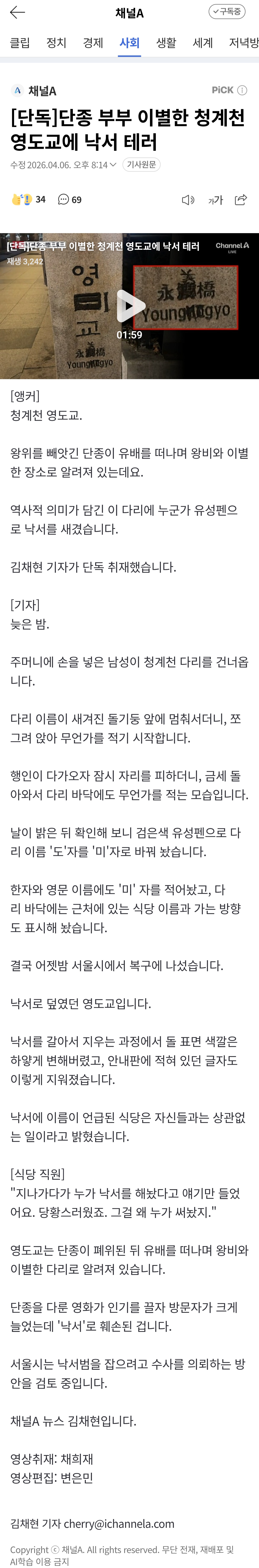 [분노]단종 부부 이별한 청계천 영도교에 낙서 테러 작성자버드와이저|작성시간26.04.08|조회수2,139 목록 댓글 11 글자크기 작게가 글자크기 크게가 엽기 혹은 진실(세상 모든 즐거움이 모이는곳)출처 : https://n.news.naver.com/article/449/0000340759?sid=102 다음검색 현재 게시글 추가 기능 열기 북마크 공유하기 신고 센터로 신고 댓글 댓글 11 댓글쓰기 답글쓰기 댓글 리스트 작성자변치않는 믿음 | 작성시간 26.04.08 동물보다 못 한 인간이 많네 작성자알고보니또라이 | 작성시간 26.04.08 ㅎ 한심한 생퀴 작성자졸린人 | 작성시간 26.04.08 관종... 작성자LUN8 카엘 | 작성시간 26.04.08 요즘 정신이상한 사람들이너무많다 작성자재-쥬래갠 | 작성시간 26.04.09 저런 인간들은 머리에 뭐가 들었는지 궁금하다 댓글 전체보기
