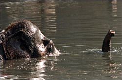 호수에서 코끼리가 헤엄치도록 놔두자 밖에서는 오직 코와 두 개의 혹만 볼 수 있었는데