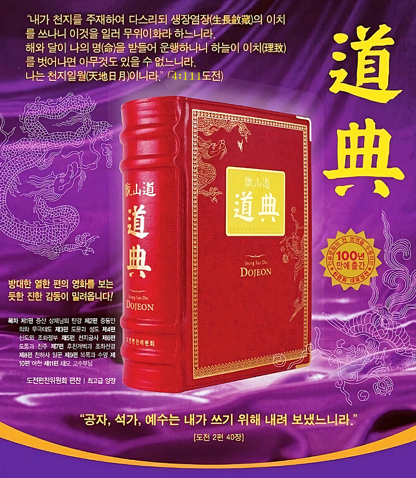 『도전(道典)』은 하나님의 자서전이고, 하나님의 생활 기록부다. 이『도전(道典)』하나 나오려고 100년을 소모하고 다 희생해버렸다. 기존의 경전이라는 것은 하나님 문화를, 뿌리를 뽑아버린 책들이다.