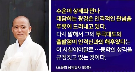 수운이 능히 유교의 테 밖에 벗어나 진법을 들춰내어 신도(神道)와 인문(人文)의 푯대를 지으며 대도의 참빛을 열지 못하므로 드디어 갑자(甲子 : 道紀前 7, 1864)년에 천명과 신교를 거두고 신미(辛未 : 道紀 1, 1871)년에 스스로 이 세상에 내려왔나니