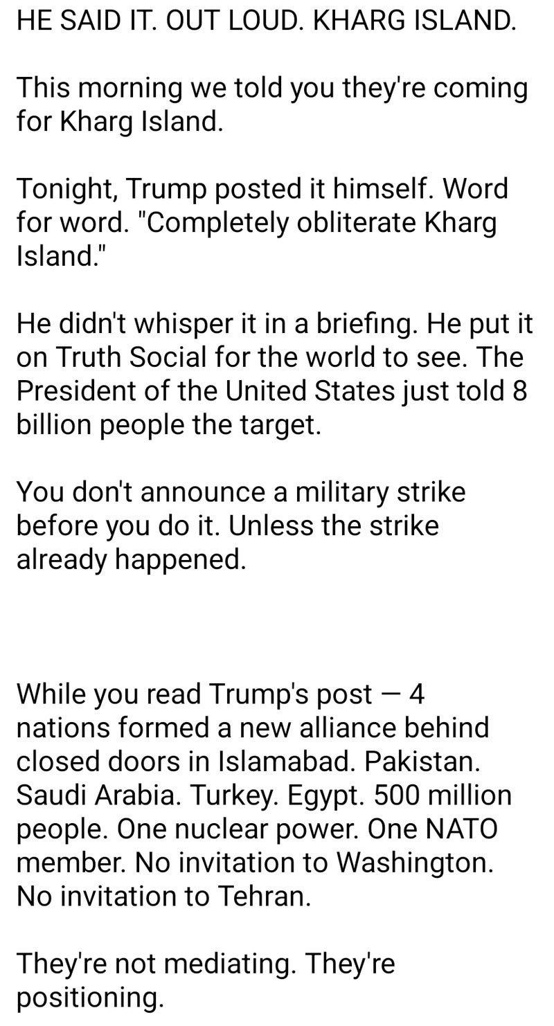 당신이 트럼프의 게시물을 읽고 있는 그 사이에도, 이슬라마바드의 밀실에서는 4개국에 의한 새로운 동맹이 결성되어 있었습니다. 파키스탄, 사우디아라비아, 터키, 그리고 이집트. 총 인구는 5억 명입니다. 핵 보유국이 1개국입니다. NATO 가입국이 1개국입니다.