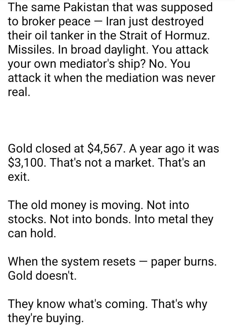 평화의 중재자가 될 예정이었던 그 파키스탄--그 파키스탄의 석유 탱커를 이란이 호르무즈 해협에서 파괴한 지 얼마 되지 않았습니다. 미사일에 의한 공격입니다. 대낮에 당당하게. 중개 역할을 하는 상대의 배를 공격하는 일이 있을 수 있을까요? 아니, 있을 수 없는 일입니다. 그것은 애초에 중개 등이 처음부터 진지하지 않았던 경우에만 일어날 수 있는 일입니다.