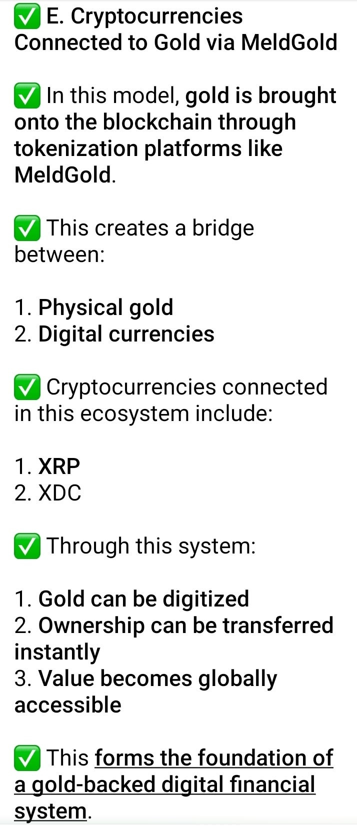 위의 목록이 축소되었습니다... 주요 ISO 통합 암호화폐가 포함됩니다: XRP XLM Algo HBAR XDC 이 자산들은 다음 이유로 선택됩니다. 이 모델인 골드는 Meldgold와 같은 토큰화 플랫폼을 통해 블록체인에 흡수됩니다.