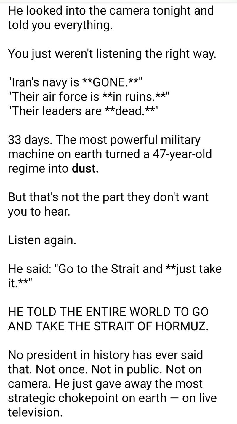 그는 브리핑 자리에서 작은 목소리로 속삭인 것이 아닙니다. 전 세계 누구나 볼 수 있도록 'Truth Social'에 글을 남긴 것입니다. 미국 대통령이 80억 명의 전 인류를 대상으로 공격 목표를 발표한 것입니다.