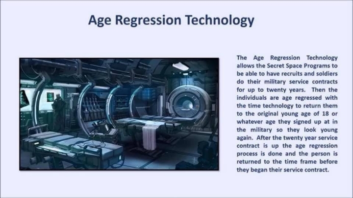 연령 퇴행 기술은 비밀 우주 프로그램이 신병들과 군인들이 최대 20년 동안 군복무 계약을 하도록 할 수 있게 해준다. 그리고 나서 개인은 원래 18세의 어린 나이 또는 군대에 입대했던 어떤 나이로 다시 젊어 보이게 하기 위한 시간 기술로 나이를 퇴보하게 된다. 20년 서비스 계약이 만료된 후 연령 퇴행 프로세스가 완료되고 그 사람은 서비스 계약을 시작하기 전의 기간으로 되돌아간다.
