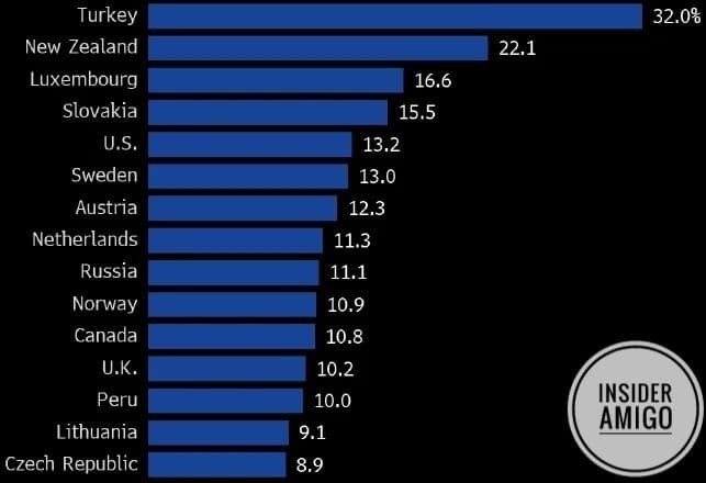 특히 영국, 한국, 뉴질랜드, 캐나다, 터키에서 강한 성장이 이어졌다. 이 모든 것이 모호하지 않고, 세계적인 인플레이션과 부동산 시장의 거품을 가속화한다.