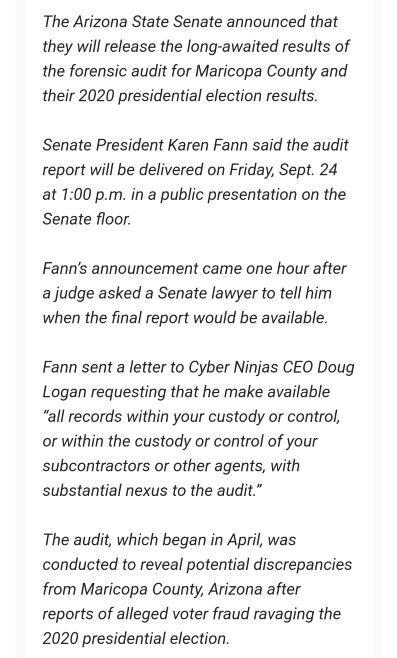 애리조나 감사 결과는 24일에 이루어질 것이라고 확신합니다! 이것으로 도미노가 시작됩니다!
