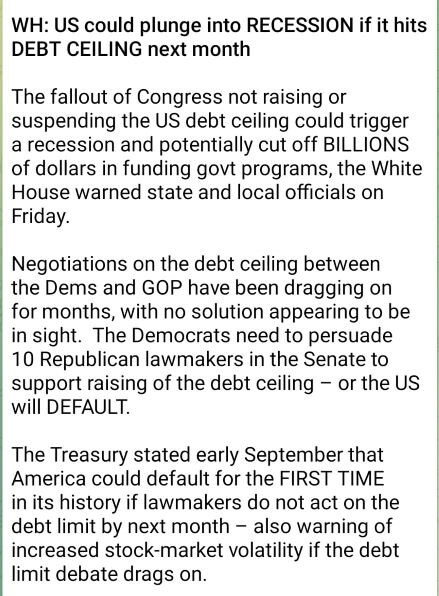 2. 현재 연방준비은행은 미국차입이 10월까진 못받아 차입을 더 늘릴 수 있도록 국회에서 결단을 하지 않는 한 미국은 망한다고 합니다.