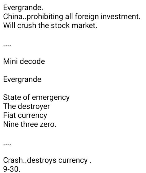 간단한 암호 해독. 에버그란데 비상사태 선포 디스트로이어 피아트 통화 930. 대폭락. 통화 붕괴.