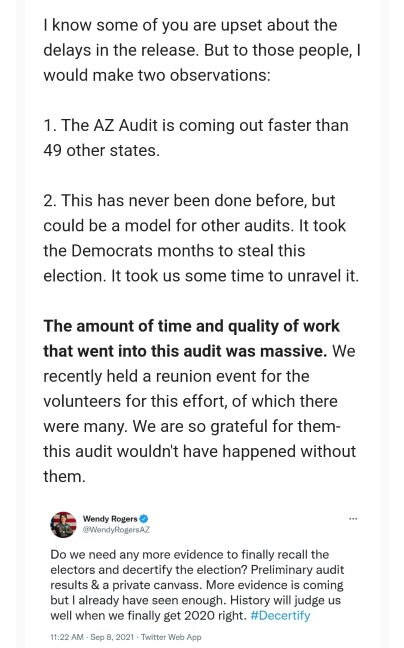 2. 이러한 감사는 지금까지 처음 한 일이라 시간이 걸렸습니다라고 써 있습니다. 또한 이 감사가 모델이 되어 다른 주 감사가 상당히 단축된다고 쓰여 있습니다. 그 외에는 민주당이 몇 달에 걸쳐 2020년 선거를 빼앗은 만큼, 그것을 해독하는 데에도 몇 달이 걸렸다고 쓰여 있습니다.