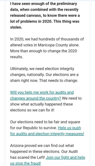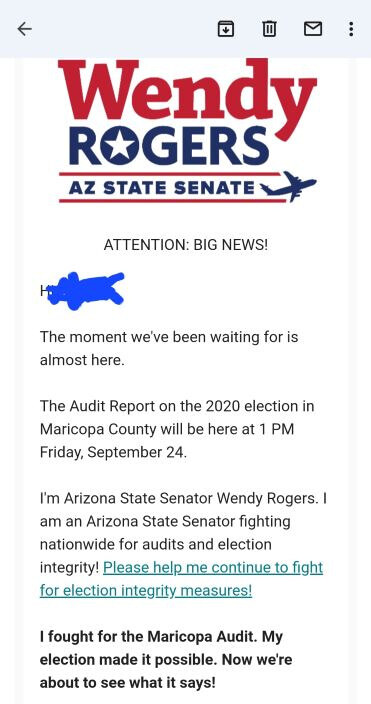 우선 오늘 제목에 대해서 정말 곤란했어요. 왜냐하면 몇 가지 정보가 제목이 되어도 좋으니까요! 그리고 애리조나 감사 결과 건으로 결정한 데에는 이유가 있습니다. 그건 오늘 저에게 애리조나 주의원인 웬디 로저스 씨로부터 24일짜 확인메일이 왔기 때문이에요! 그녀의 뉴스레터에 제가 등록을 해서 오늘 그런 메일이 왔어요!