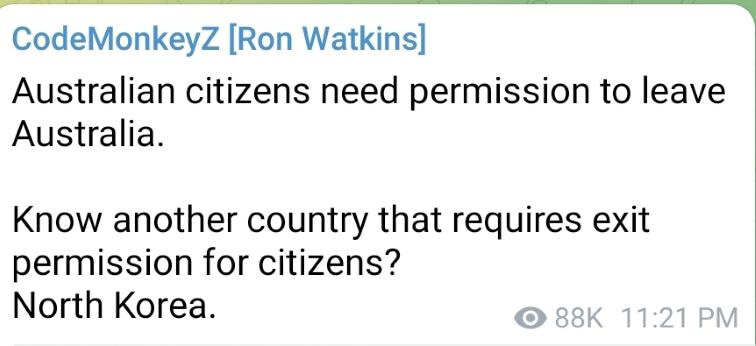 A, 호주 시민들은 호주에서 나올 때는 정부로부터 허가가 없으면 나라를 나갈 수 없게 되었다고 해요! 이것은 현재의 북한과 같은 법이라고 써 있어요.