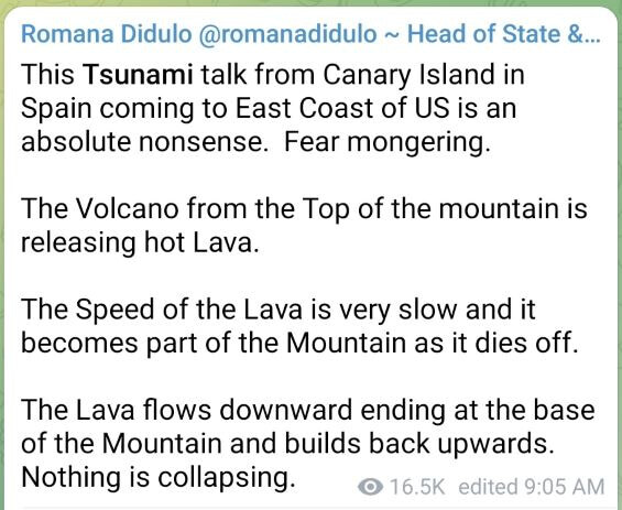 5. 이번에는 캐나다공화국의 로마나 디두로 최고사령관이 어제 제가 쓴 라파르마 제도의 화산이 분화했기 때문에 일부 섬이 수몰되어 큰 해일이 미국 동해안이나 동부지구의 주에 도달한다고 썼는데 그것은 전부 넌센스라고 쓰고있습니다! 그냥 공포를 가져오는 작전이라고도 쓰여있습니다.(악마군에 의해 정보가 흘러나왔다고 생각합니다.)