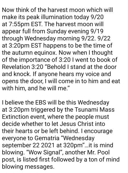 저는 긴급방송이 가동되는 것이 이번 주 수요일 오후 3시 20분이라고 생각합니다 라고 써 있습니다. 또 그날에 "절명 이벤트도 일어난다"고 쓰여있습니다.