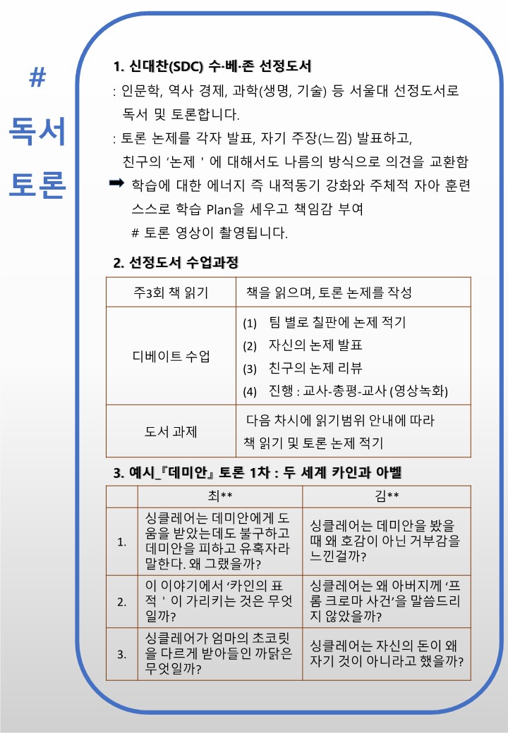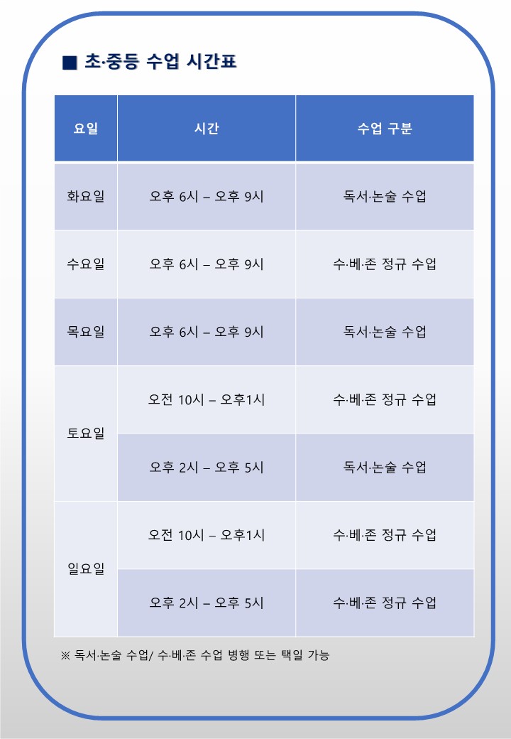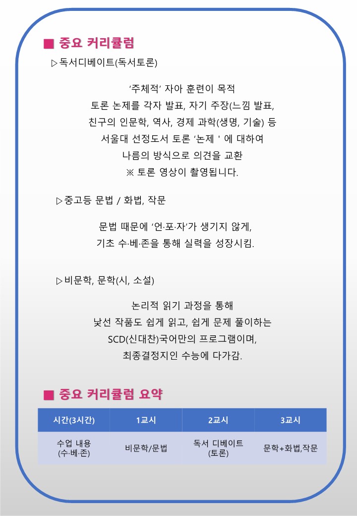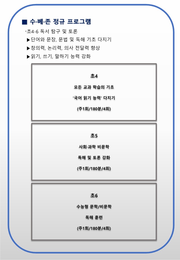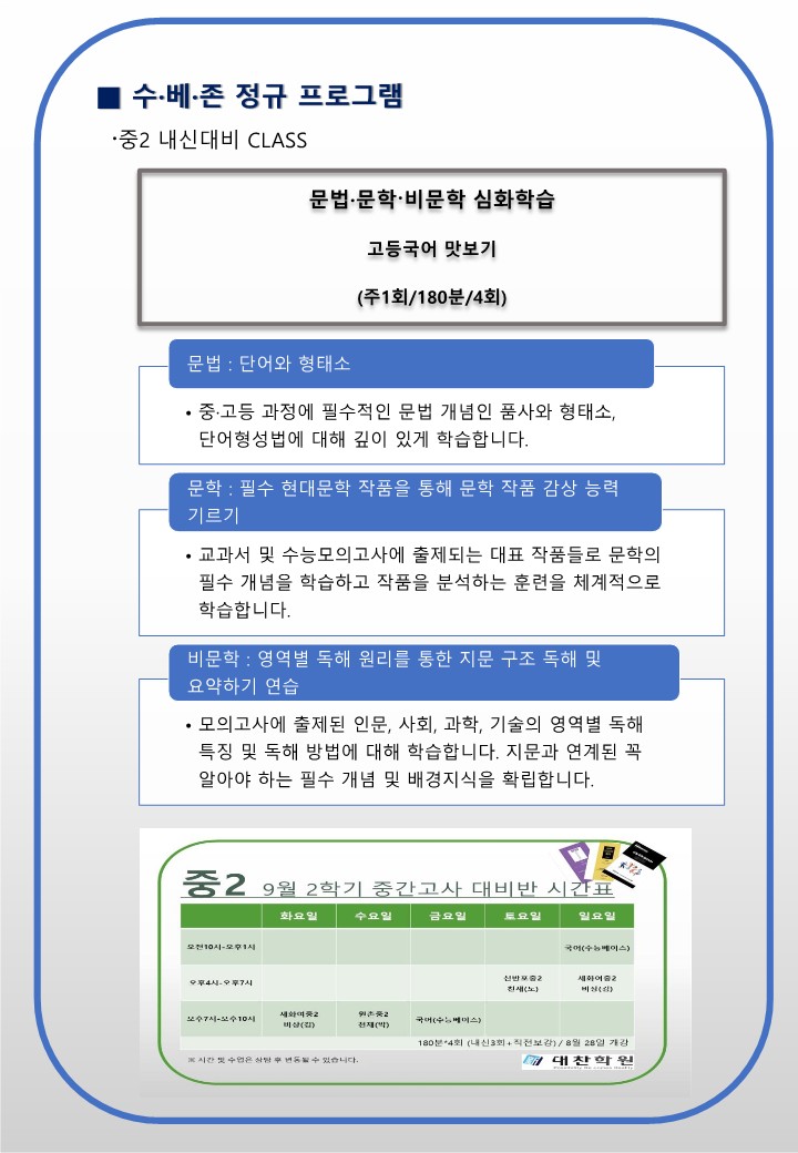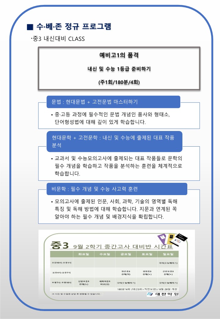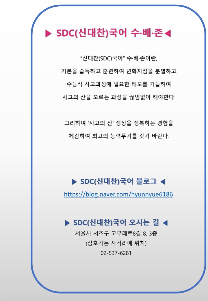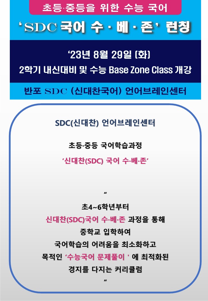 서초 반포국어학원(초.중등 시간표 )수능 국어 최강자 SDC(신대찬국어) 수.베.존 초중등부 런칭/내신대비클래스 개강 작성자H.Y상위|작성시간23.09.01|조회수80 목록 댓글 0 글자크기 작게가 글자크기 크게가 다음검색 현재 게시글 추가 기능 열기 북마크 공유하기 신고 센터로 신고 댓글 댓글 0 댓글쓰기 답글쓰기 댓글 리스트