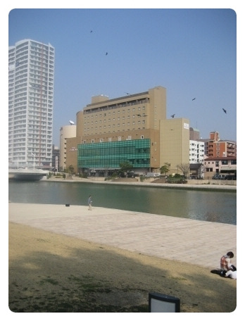 자전거 바지, 자전거 셔츠, 잠바를 껴입고 밑에 하카타 파크 호텔을 나섭니다.