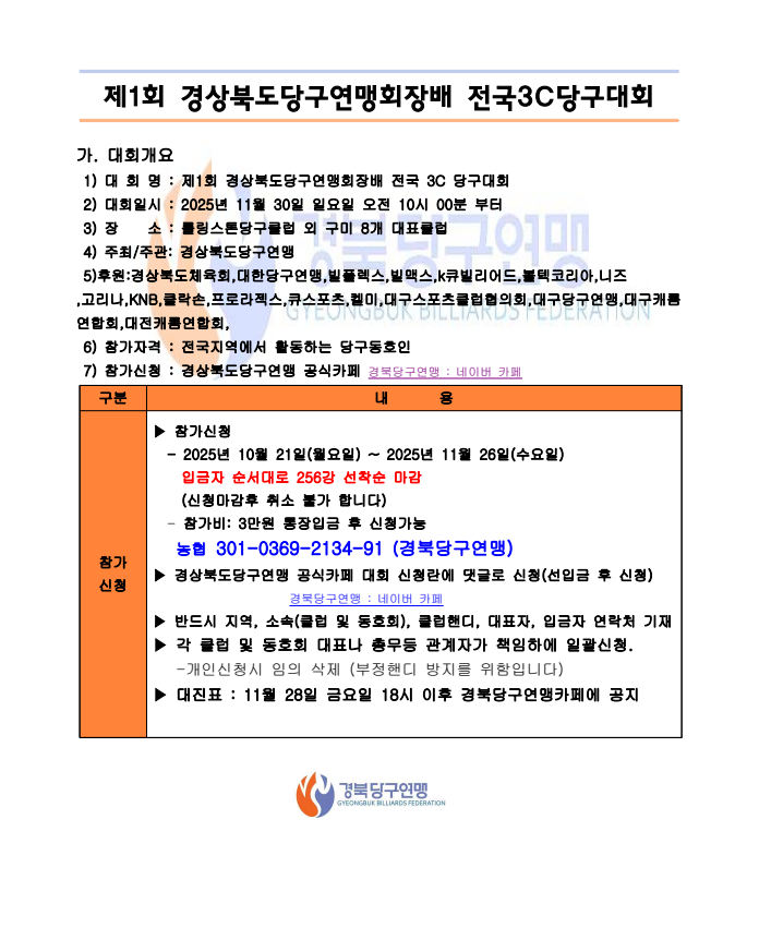 제1회 경상북도당구연맹회장배 전국3C당구대회 작성자김기웅|작성시간25.10.30|조회수1,843 목록 댓글 0 글자크기 작게가 글자크기 크게가 다음검색 현재 게시글 추가 기능 열기 북마크 공유하기 신고 센터로 신고 댓글 댓글 0 댓글쓰기 답글쓰기 댓글 리스트