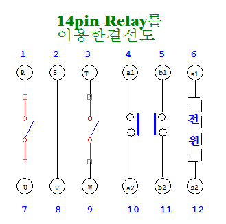 - 14핀 릴레이를 이용 할 경우 접점이 1회로 부족하므로 S상은 직결한다