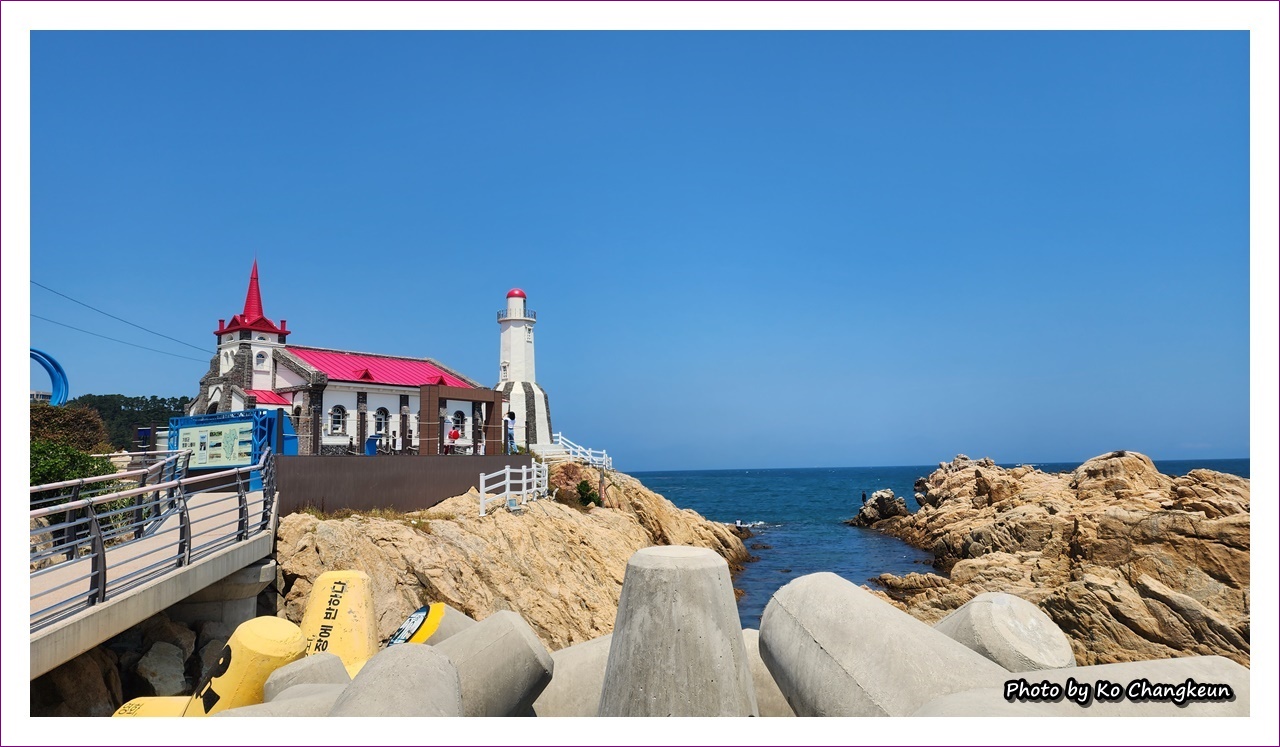 놓은 것 같은 풍경은 마치 한 폭의 그림 같다. 바위 위로 부서지는 하얀 포말은 성당의 붉은 지붕과 대비되어 이곳을 찾는 이들의 시선을 한눈에 사로잡는다. 죽성성당에서 가장 많은 이들이 줄을 서서 기다리는 곳은 마치 액자의 프레임을 그대로 옮겨 놓은 듯한 포토존이다. 액자 속으로 들어간 푸른 바다와 하늘이 더없이 아름다운 배경을 만들어 준다.