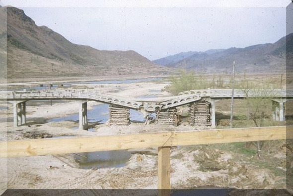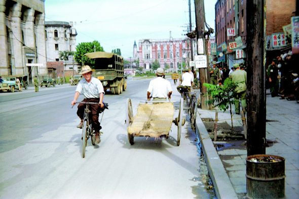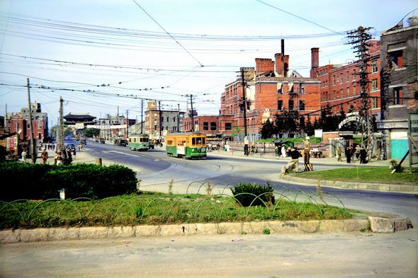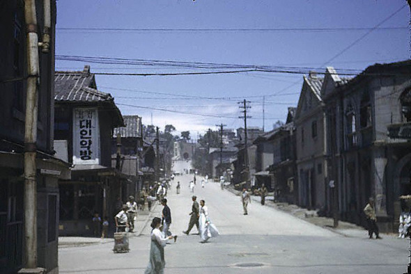 서울역 앞 세브란스 의과대학, 멀리 숭례문이 보이고 전차가 다니고 있다. 1952년 초