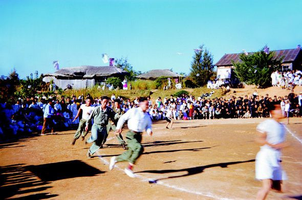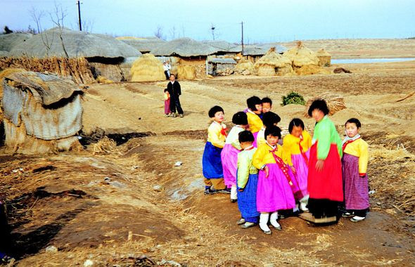 색동옷을 차려입고 설날 널뛰기를 하는 아이들, 1953년 설날(김포 통진)