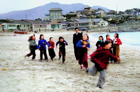 부산 송도 바닷가의 어린이들 뒤로 적산가옥들이 보이다. 1952년 가을