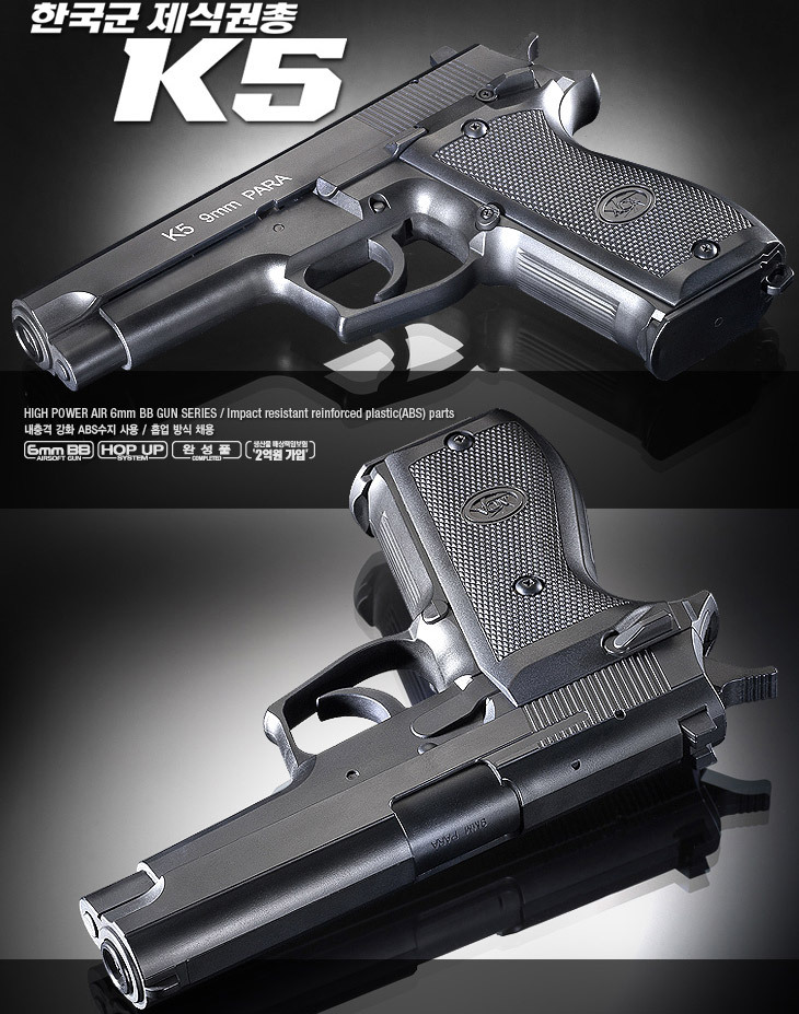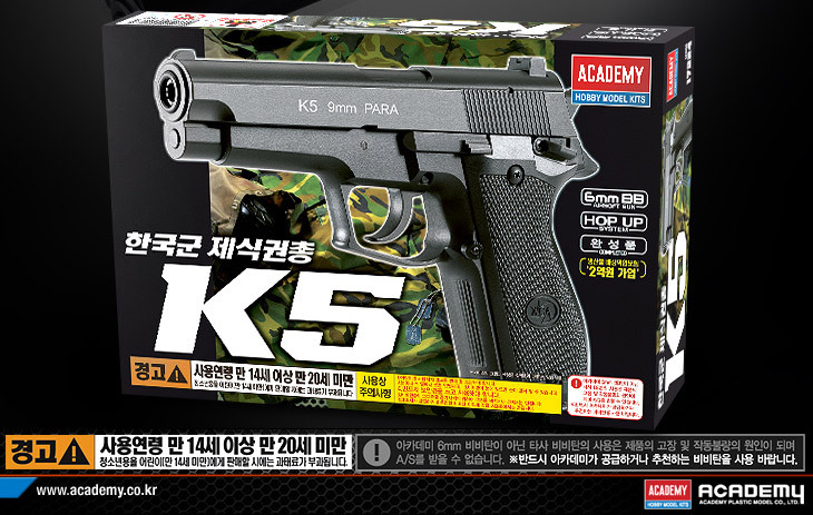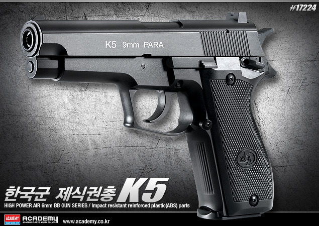 우리 국군 제식권총으로 실제 군 간부들 사이에서 사용되고 있는 K5 권총을 아카데미에서 완구화 했다.