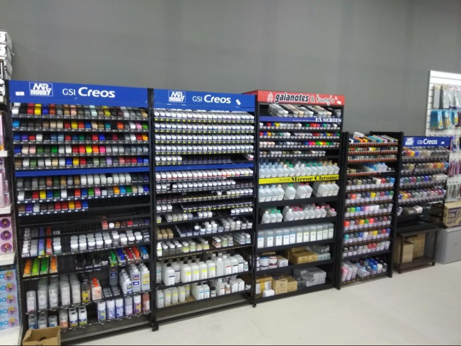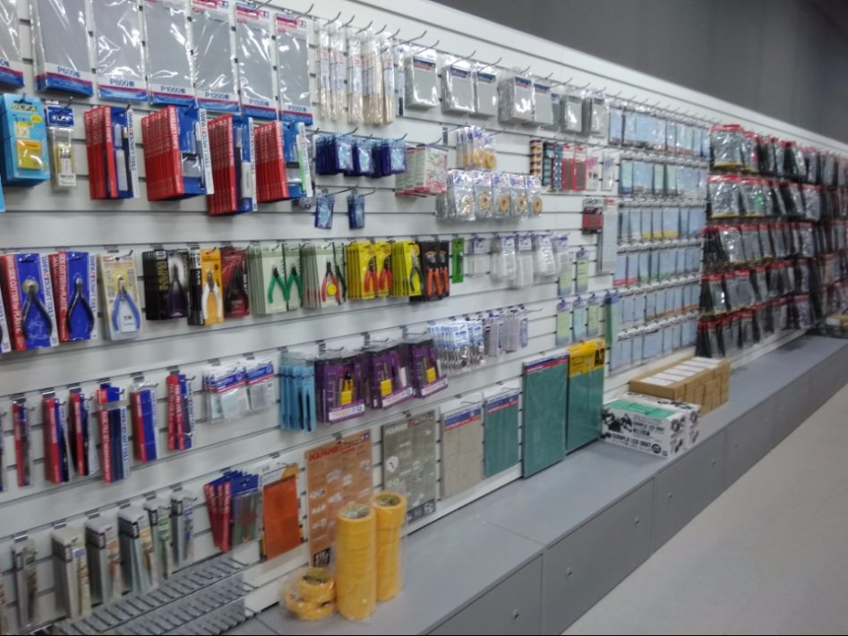 조립용 도구와 공구는 물론 다양한 종류의 도료와 신너를 갖추고 있어서 웬만한 모형점은 저리 가라할 정도이다.