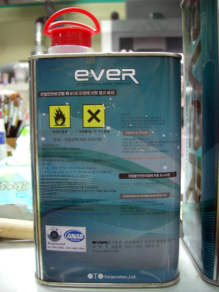 주제 4, 경화제 1, 세척용 신너 3 의 비율로 희석하여 컴프레셔 압력을 2.0 이상으로 강하게 세팅하여 뿌려 줬습니다.