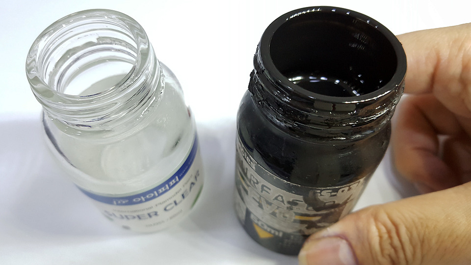 블랙 서페이서에 유광 클리어를 살짝 섞어서 뿌려주면 따로 유광 검정을 칠할 필요가 없다는 뭐 나름의 꼼수 ㅋㅋ