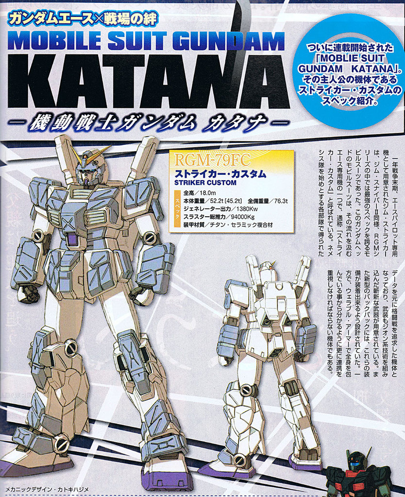 카타나팀 ? 팀은 모르겠고 일본쪽 만화책으로 건담 카타나라고 있어요 그게 짐스트라이커에 사진 오른쪽 건담 해드가 달리고 양손에 돈파(격투무기) 같은 스타일 무기를 를 쓰는 녀석이 있어요 형식번호 RGM-79FC 그녀석 인것같네요