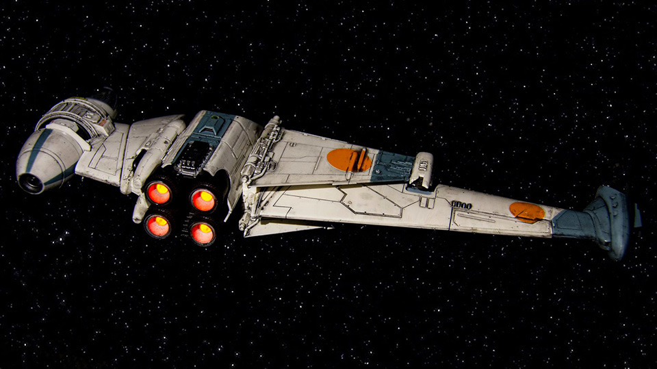 날개를 펴지 않은 걸로 봐서 이제 막 광속비행을 마치고서 맞딱뜨리는 장면으로 연출하지 않았나 싶습니다.