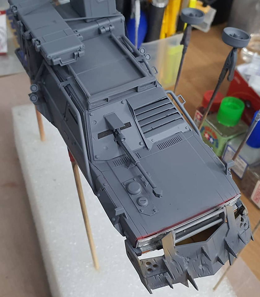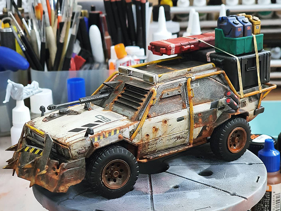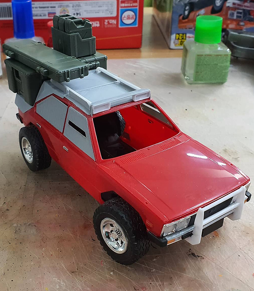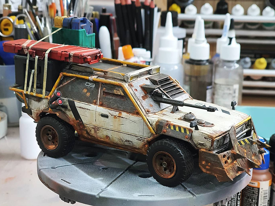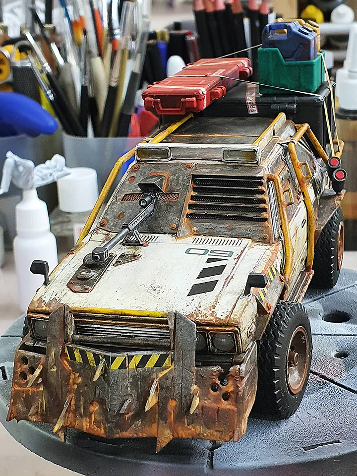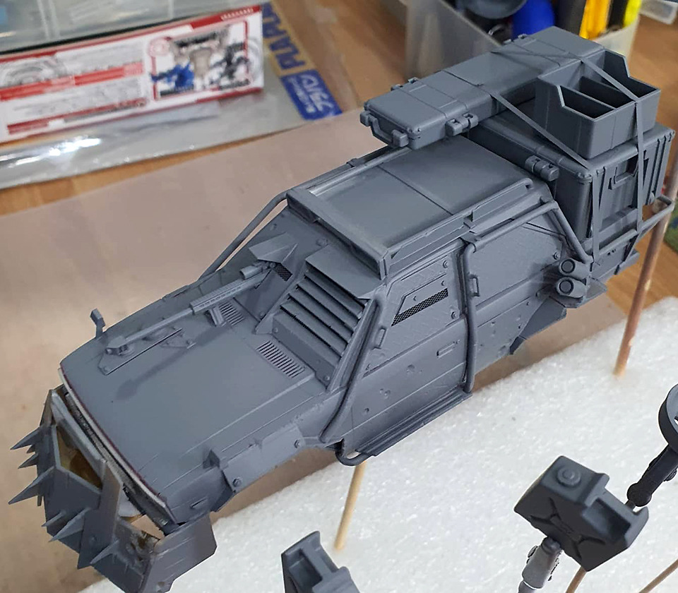 유리창은 죄다 철판으로 용접하고서 일부만 노출되도록 해줬구요, 조수석엔 거대한 라이플을 장착해주셨더라구요.