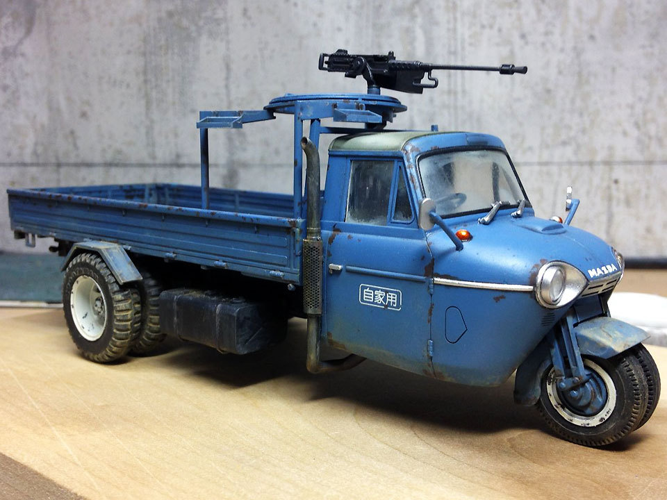 짐칸에 무장 하나만 탑재해줬을 뿐인데, 고물차였던 3륜 트럭이 뭔가 굉장해 보이기까지 합니다.