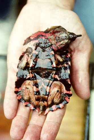 거북류 가운데 가장 특이한 형태로, 머리는 납작한 삼각형 모양이며 등딱지와 피부가