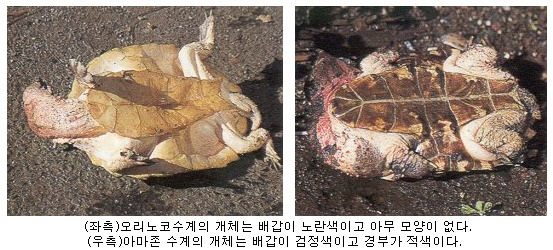 일반적으로, 오리노코 수계의 개체는 등갑이 밝은 색을 하고 있으며, 복갑에서는 얼룩무늬를 볼 수 없다.