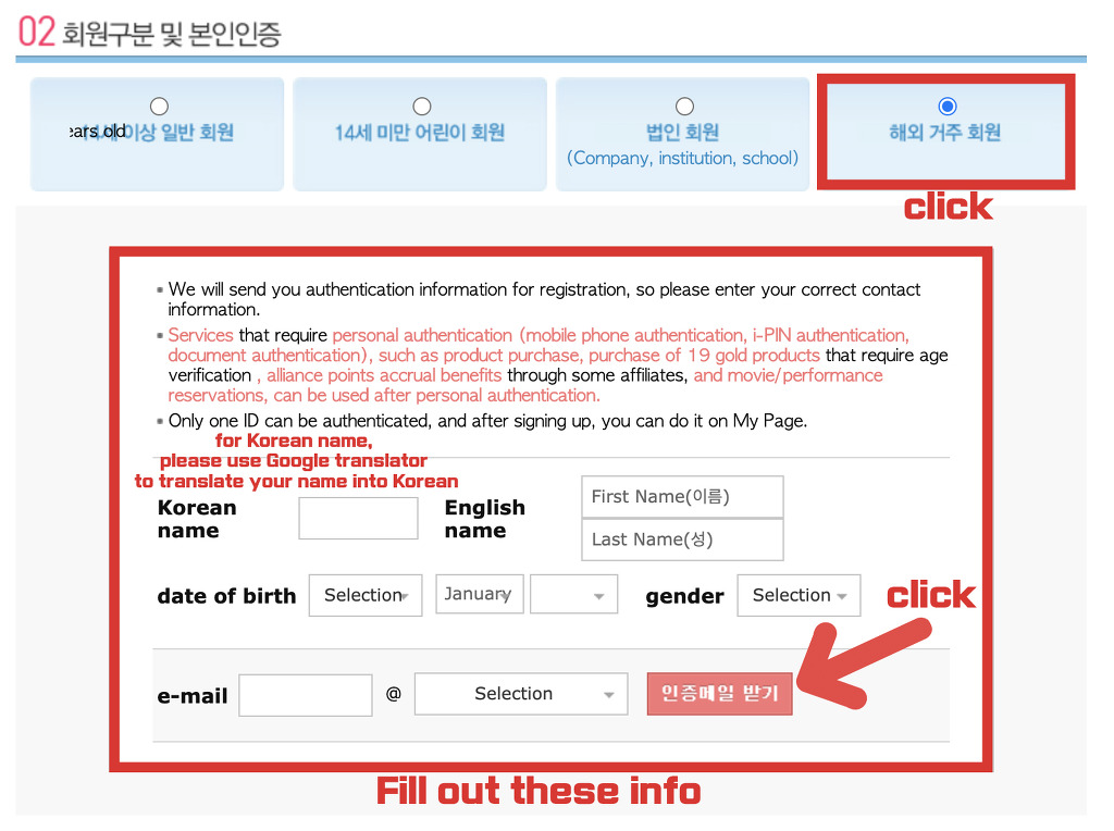 4-2. Fill out the info and click "인증메일 받기". For Korean name, please use Google translator to translate your name into Korean.