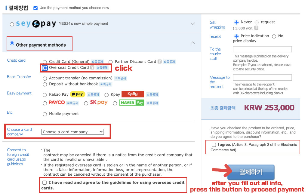 10. Click Overseas Credit Card and choose your credit card (VISA, MASTER..etc) and press [결제하기] to proceed your payment.