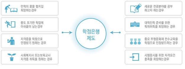 학점은행제는 개인 사정 등에 의해 고등교육의 기회를 놓친 사람들이, 평가 인정된
