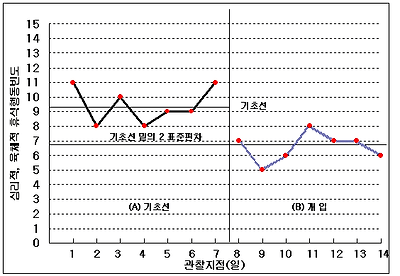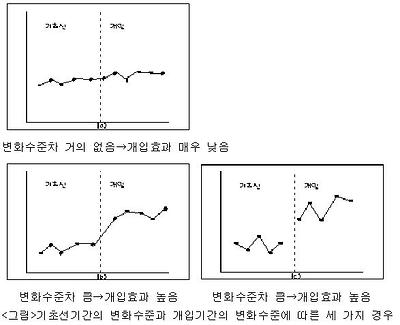 그러므로 기초선과 개입기간에 있어서 변화의 파동이 심하면서 관찰의 회수가 적은 조사의 결과를 가지고는 개입의 효과를 판단하기 힘들다.