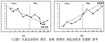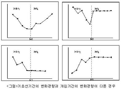 또한 기준선기간의 변화경향과 개입기간의 변화경향이 다른 형태로 연결되어 개입의 효과를 알 수 있는 경우와 없는 경우가 있다.