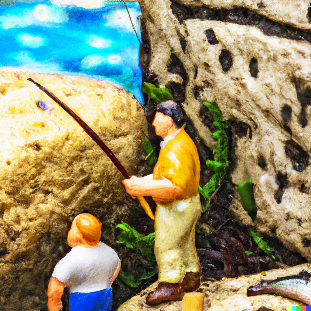 장난감을 갯바위에 가져다 놓은듯한 낚시하는 가상의 모습을 그린 그림은 신비로운 분위기와 함께 매우 창의적인 작품으로 평가됩니다. 그림 속에서는 갯바위 위에 마치 장난감을 놓은 듯한 낚시꾼과 낚시대가 있는 모습이 그려져 있습니다. 낚시대의 모습도 실제로 사용하는 것처럼 자연스럽게 묘사되어 있습니다.