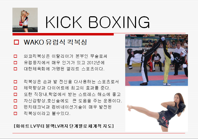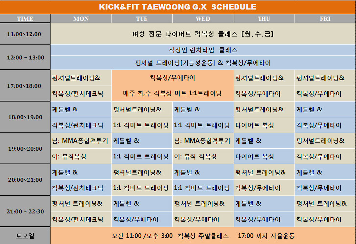 오전 주부다이어트 킥복싱 클래스: 매주 월,수,금 오전11시 기존회비에서 30프로 DC 매주 토요일 주말 심화 클래스 오전11시 타임 오후 3시타임 약90분간 진행됨