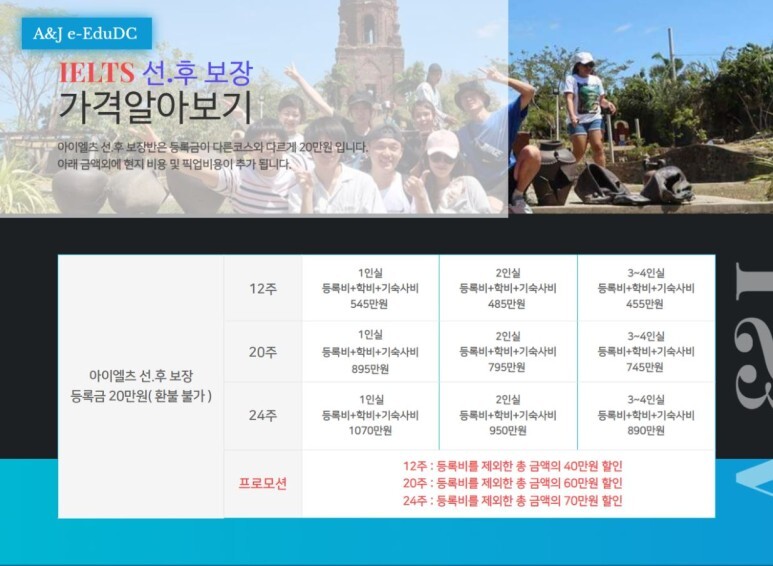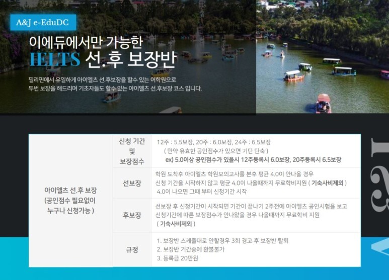 안녕하세요 최근 상담과 문의가 많아지고 있는 필리핀 바기오 이에듀어학원의 가장 독보적인 프로그램중에 하나 선보장아이엘츠 후보장아이엘츠 과정에 대해서 소개해드리도록 하겠습니다.