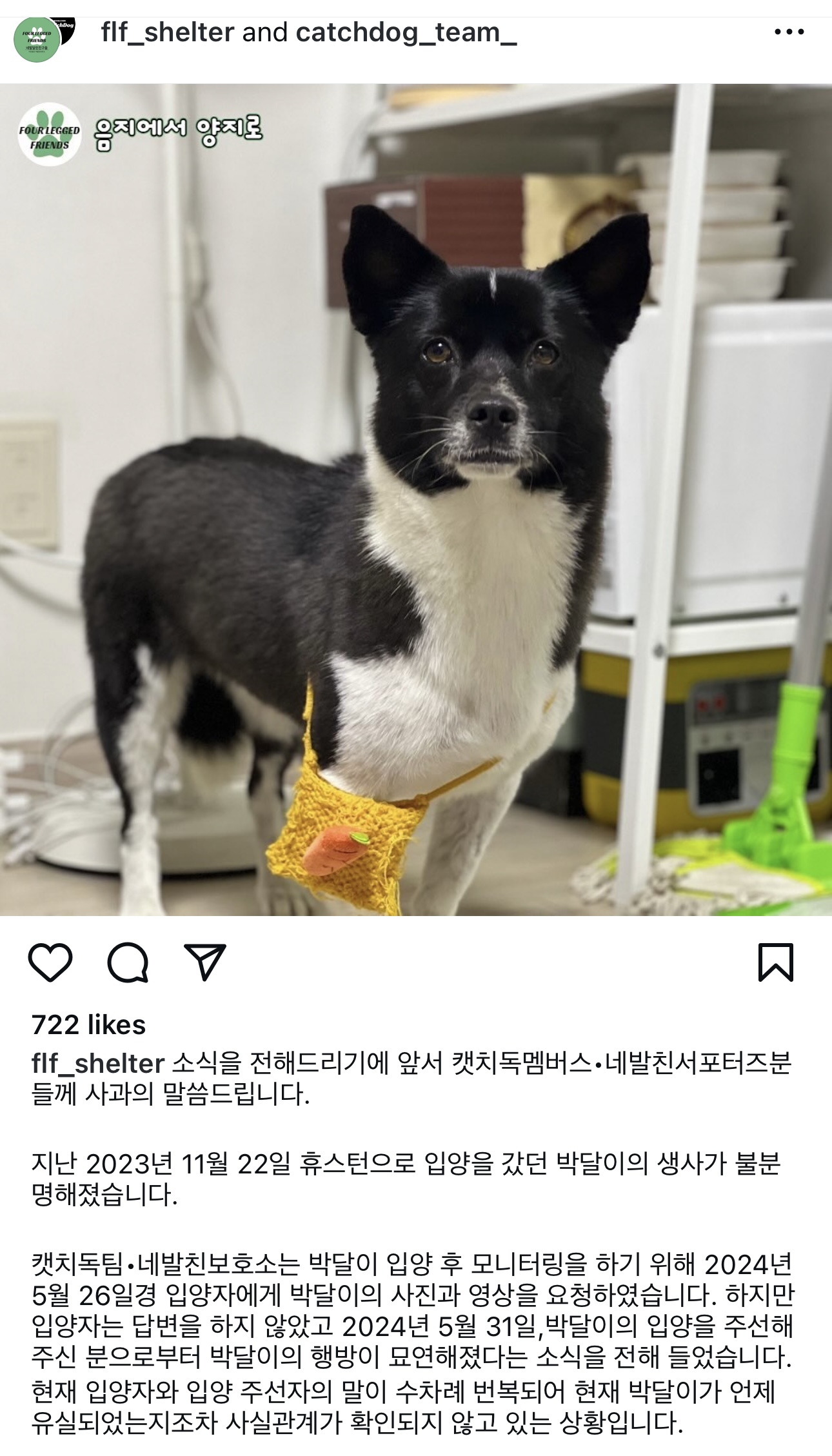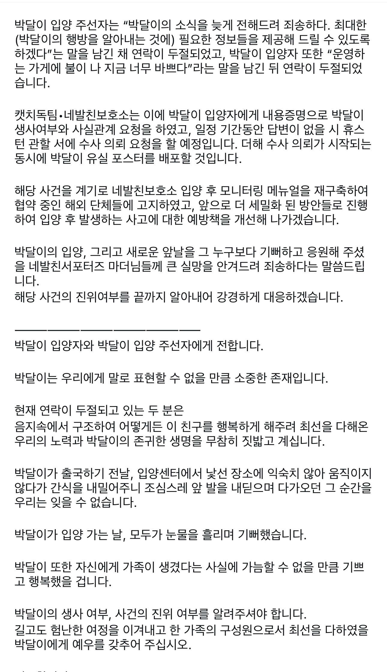 박달이가 잘 지내고 있는지, 아니면 잃어버린건지라도 쉘터에 알려주신다면 좋겠네요.. 혹시 데리고 있을 상황이 여의치않다면 제가 가서 픽업해 보호하겠습니다. 연락부탁드려요.