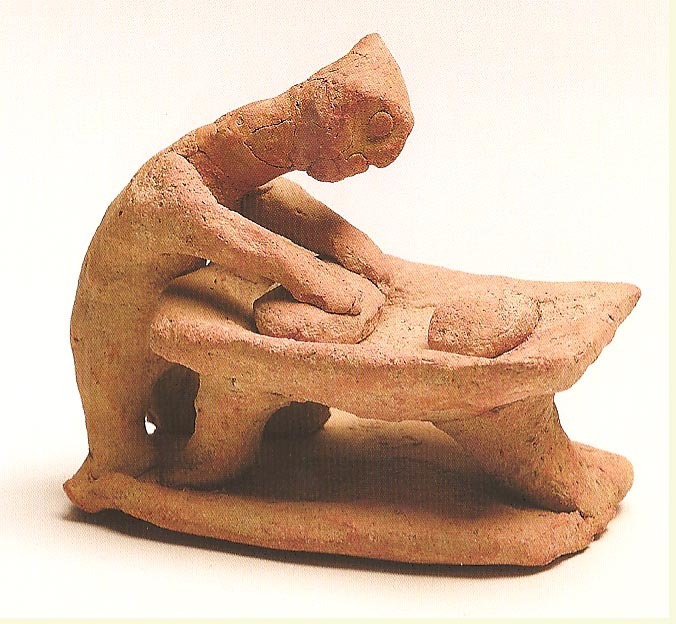 ▶ (고고학 이야기) 빵 만드는 여인상 : 이스라엘의 북쪽 지중해변에 있는 Achzib에서 발굴 : 진흙으로 만든후 불에 구어서 만들었다 : 한 여인이 빵 두 덩어리를 만들어 개방형 오븐에 올려놓고 있다. à 고고학자들은 테이블에서 빵을 만들고 있다기 보다는, 개방된 형태의 오븐에서 빵을 굽고 있는 것으로 해석한다. : 철기시대의 작품이기는 하지만, 아브라함의 아내 사라가 손님을 접대할때 이와 유사한 모습으로 빵을 구웠을 것이다.