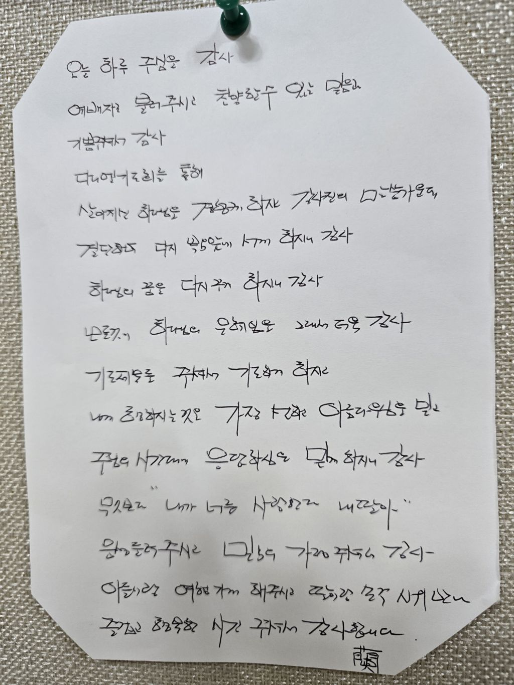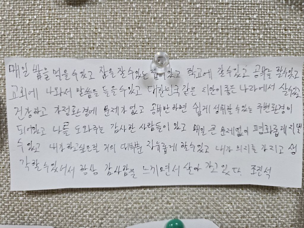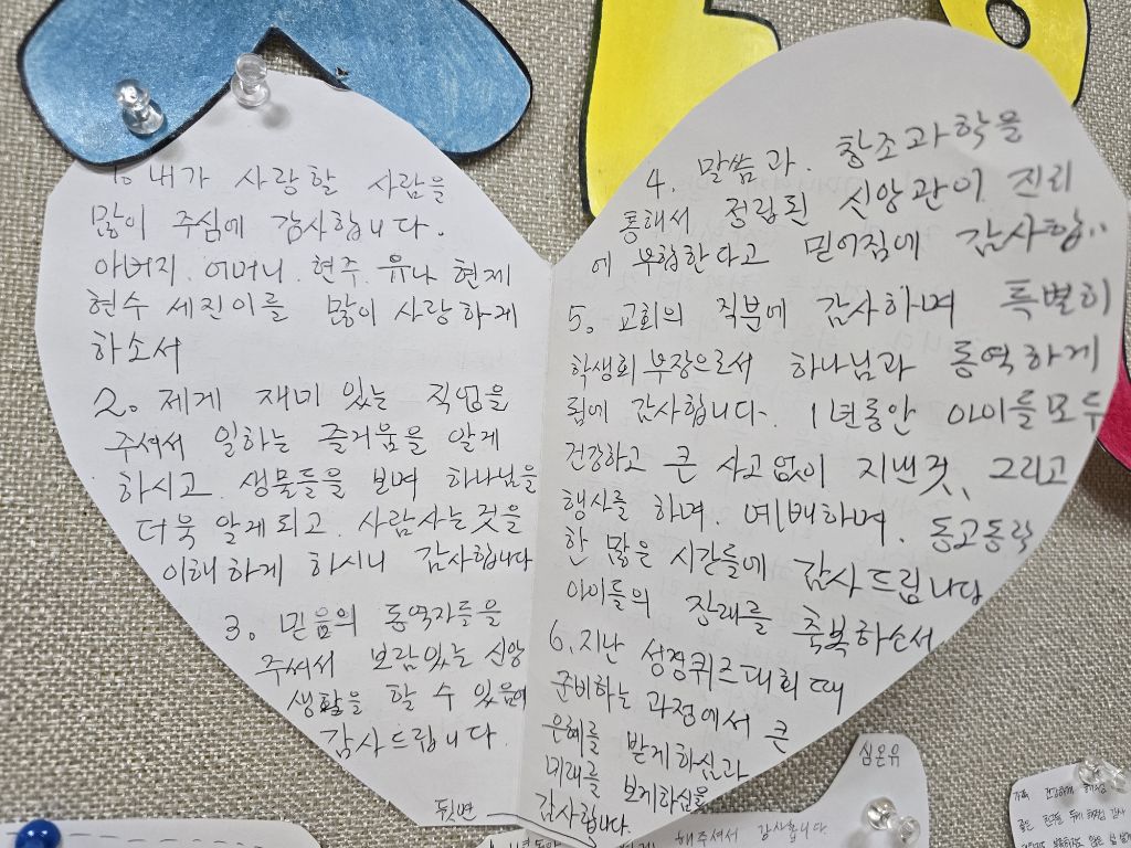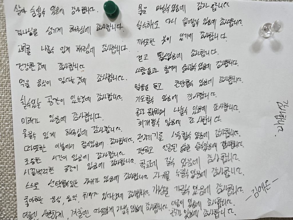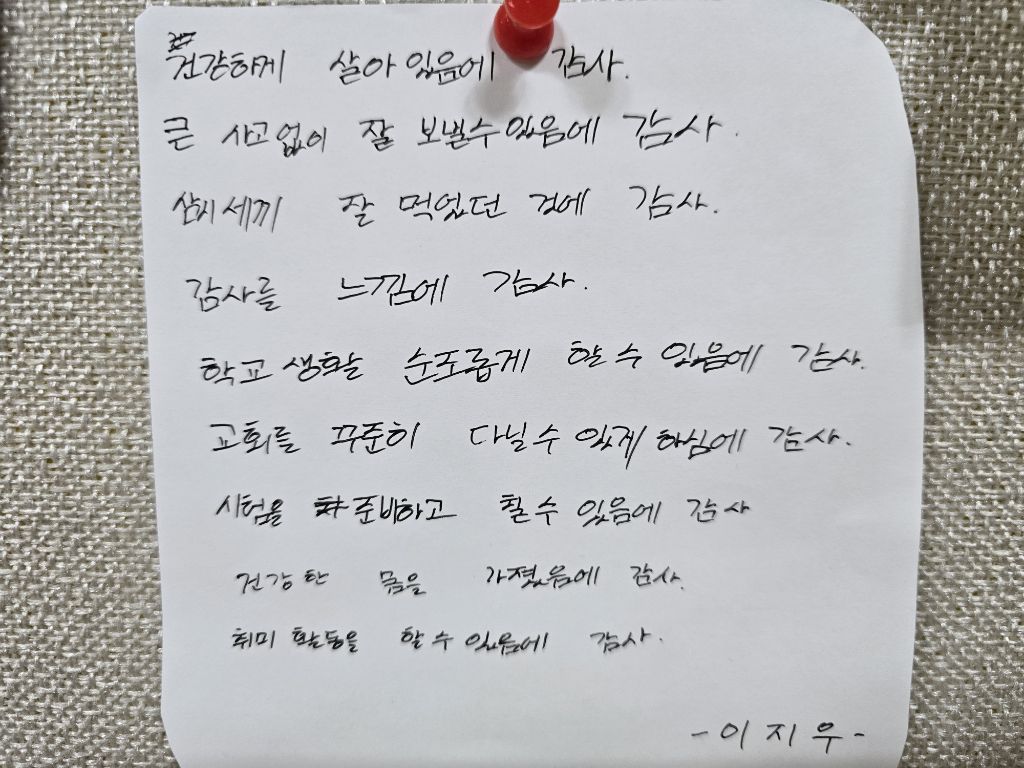 올해 추수감사절을 맞아 우리 학생부가 반별로 감사의 글을 나누는 시간을 가졌습니다. 각자의 자리에서 하나님께 받은 은혜를 돌아보며 한 글자, 한 문장에 마음을 담아 썼는데요. 당연하게 지나쳤던 일상 속에서도, 감사할 이유가 얼마나 많은지 새삼 깨닫게 되는 귀한 시간이었습니다.