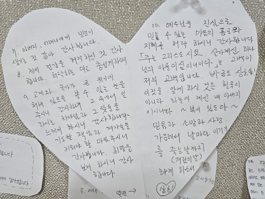 누군가는 “건강함에 감사하다”고, 또 누군가는 “교회에서 예배드릴수 있음에 감사하다”고 고백했습니다. 그렇게 모인 감사의 고백들이 하나되어, 하나님께 향한 찬양이 되고 향기로운 예물이 되었습니다.